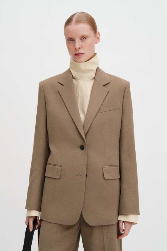 O modelo trabalhado tem acabamento de alfaiataria profissional: pences transferidas com caimento perfeito morrendo no bolso embutido, fianco estruturado, manga de duas folhas, elegante gola tailleur e forro completo.